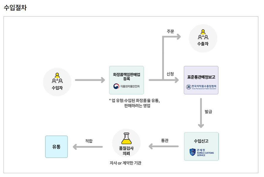 또한 화장품의 제조과정에 사용된 원료의 목록 등을 식품의약품안전처장에게 보고하여야 합니다. 수입할 때마다 통관 전에 한국의약품수출입협회장에게 「전자무역 촉진에 관한 법률」에 따른 전자무역문서로 표준통관예정보고를 하고 통관하여야 하며, 통관 후 자가품질검사(제조번호별)하여 적합한 제품만 판매해야 합니다.