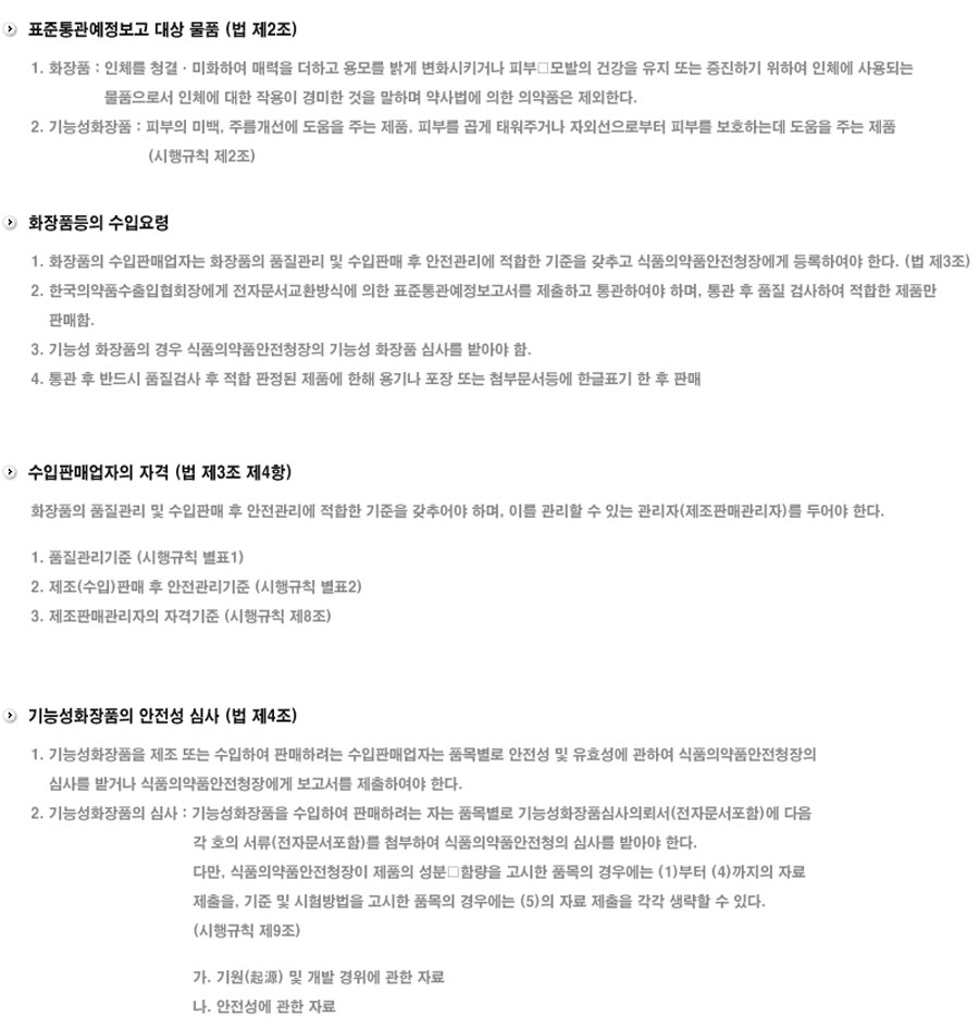 또한 화장품의 제조과정에 사용된 원료의 목록 등을 식품의약품안전처장에게 보고하여야 합니다. 수입할 때마다 통관 전에 한국의약품수출입협회장에게 「전자무역 촉진에 관한 법률」에 따른 전자무역문서로 표준통관예정보고를 하고 통관하여야 하며, 통관 후 자가품질검사(제조번호별)하여 적합한 제품만 판매해야 합니다.